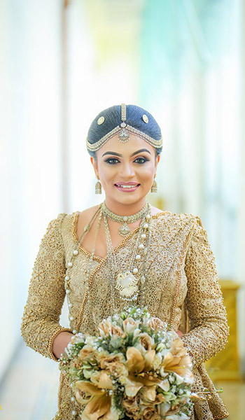 Unlike western wedding customs the regalia of a Kandyan bride is replete with exquisitely designed apparel and complemented with jewellery that gives the event a lavish look and an extra sparkle to the whole event. The traditional costume which is the Osariya (Saree) is profusely decorated with gold and silver thread, pearls, beads, sequins which gives the bride a regal look.